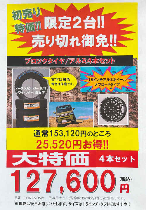 2台限定でブロックタイヤとアルミ4本セットを通常価格153,120円のところ大特価127,600円で販売しております☆彡