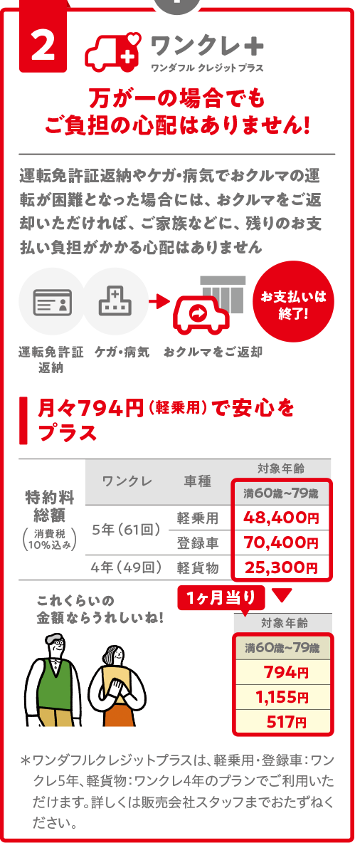 - 満60歳~79歳で、軽乗用・登録車はワンダフルクレジット5年を、軽貨物はワンダフルクレジット4年をご利用いただいたお客様がご加入いただけます。